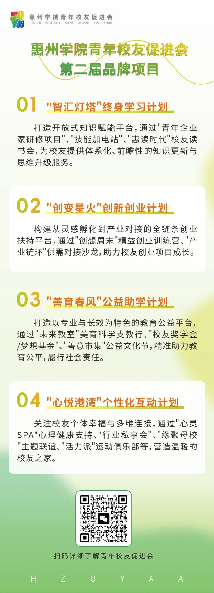 惠州学院校友会青年校友促进会是学校育人工作的延伸、校友网络的关键节点。青促会的使命,是将校友个体成长融入学校与地方发展的宏伟蓝图,让青年校友在服务社会中实现自我价值。