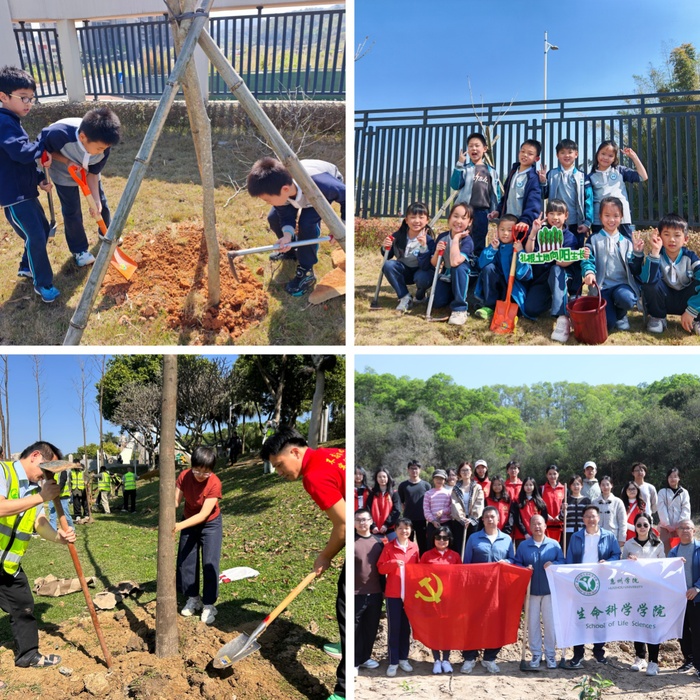 校园植树正酣,校外的绿意同样在延伸。3月12日,我校联合惠州学院附属学校、学苑社区,在附属学校内举行了一场别开生面的植树活动。两校师生代表50人齐聚现场,携手种下16株紫花风铃木。大学生与小学生“大手牵小手”,一同挥锹培土,将绿色的希望植入童年的土壤,也让高校资源赋能基础教育的探索在泥土芬芳中落地生根。与此同时,各二级学院立足专业特色,将植树护绿的课堂搬到惠州各地,让专业知识在田间地头绽放光彩:生命科学学院党委联合惠城区总工会、汝湖镇党委,走进汝湖镇上围村,携手当地居民共同种下500棵沃柑苗,绿化面积达28亩,将产学研结合的探索融入乡村振兴的绿色实践;电子信息与电气工程学院联合惠州市市政园林等单位,在东江沙公园江边开展植树活动,以实际行动为城市添绿,展现服务地方的责任担当。